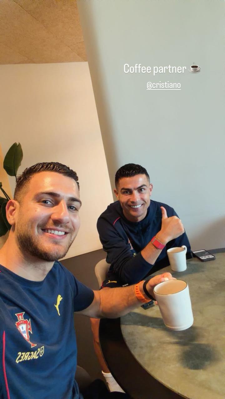 10月10日,葡萄牙国家队正在进行集训活动,期间,达洛特通过社交媒体平台分享了一张他与C罗在闲暇时光共饮咖啡的亲密自拍。